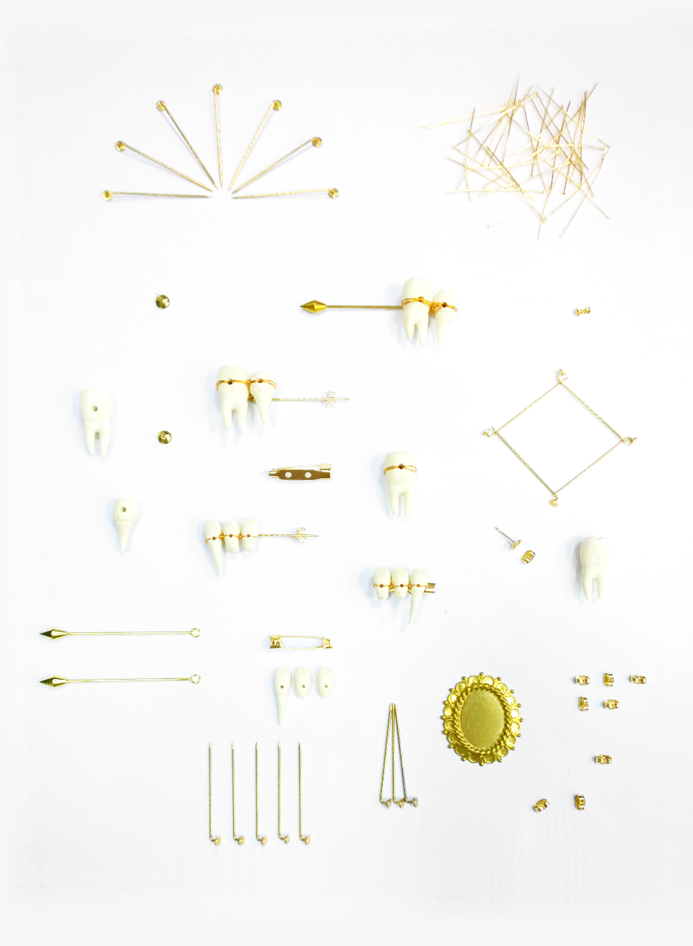Ancient dentures made of teeth from poor people were only available for the wealthy like fashion accessories. Teeth were drilled and fixed with wires and metal frames. Using same techniques, the product is to tell the story.